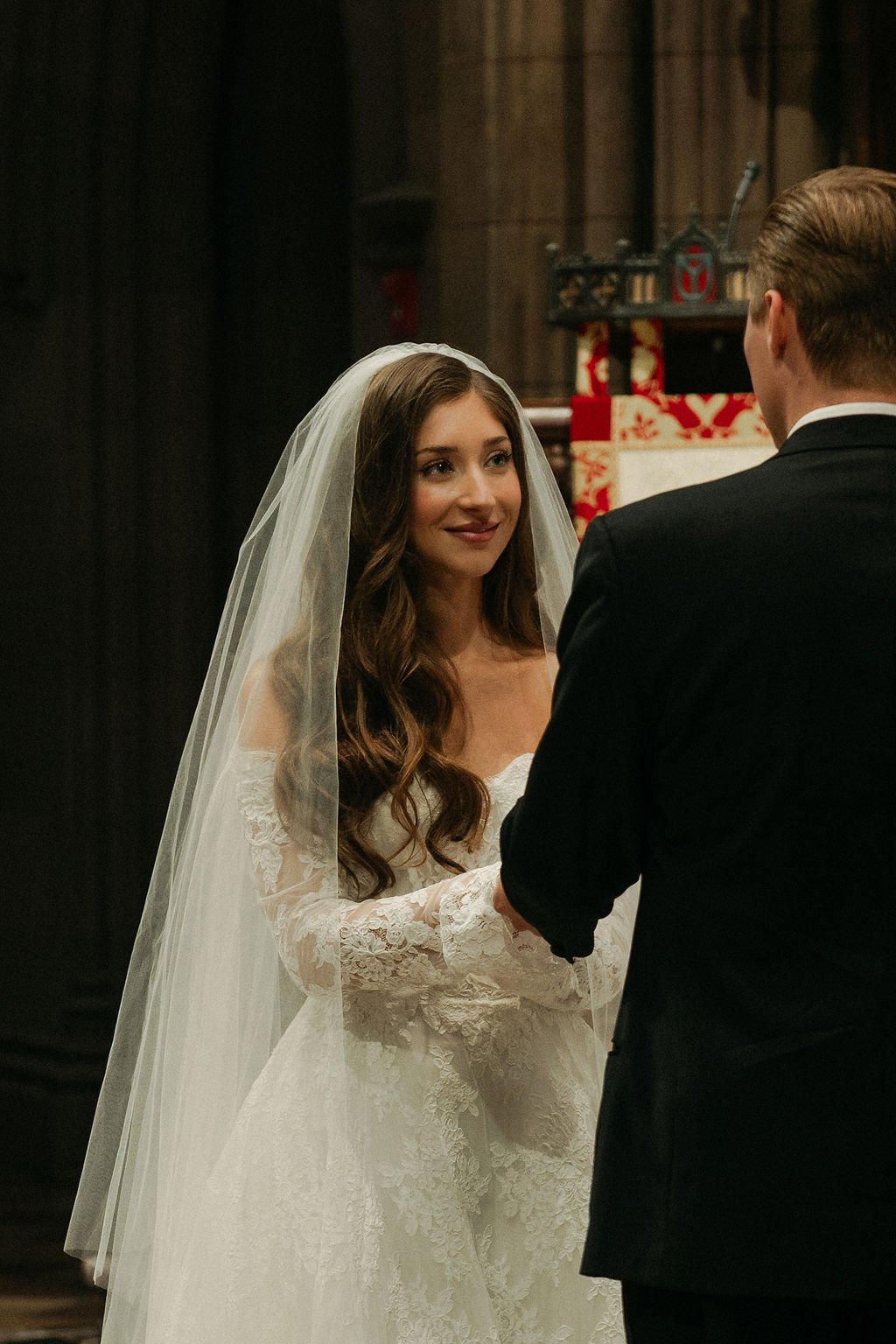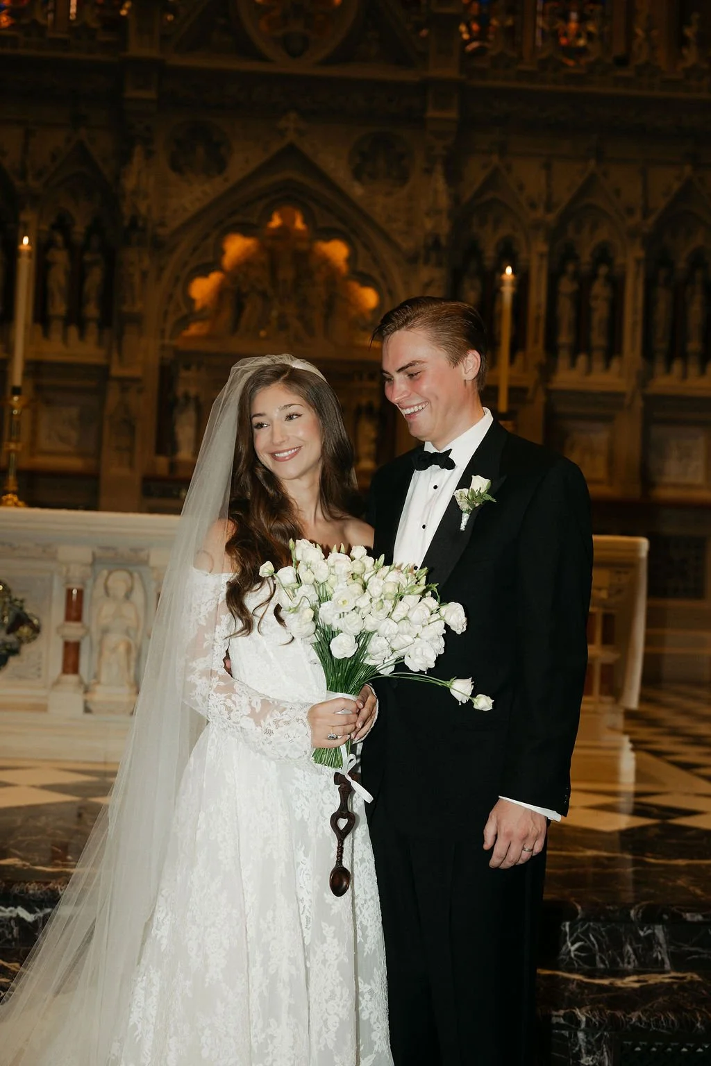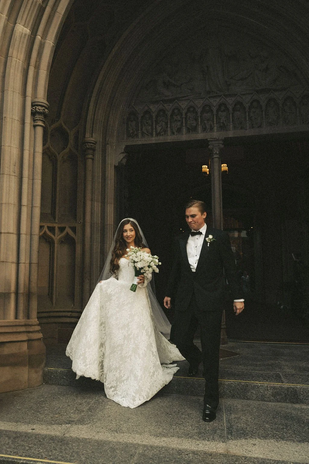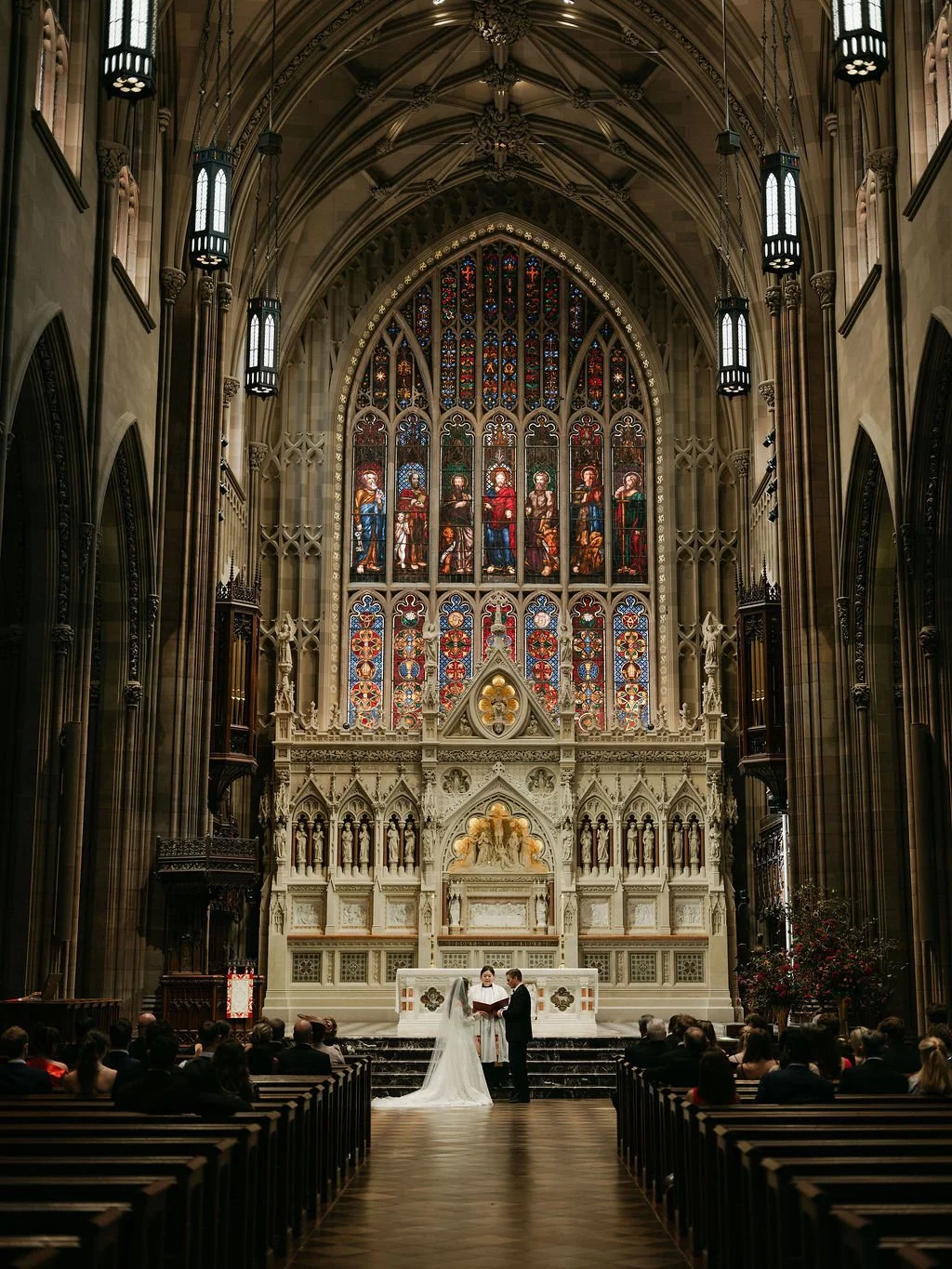 Rebecca and Spencer were married at Trinity Church, which is even more beautiful in person. The architecture is stunning from every angle - towering arches, detailed stonework, and stained-glass windows that fill the space with the softest, most atmospheric light. The whole church feels regal and calm - its deep rooted history settling around you.