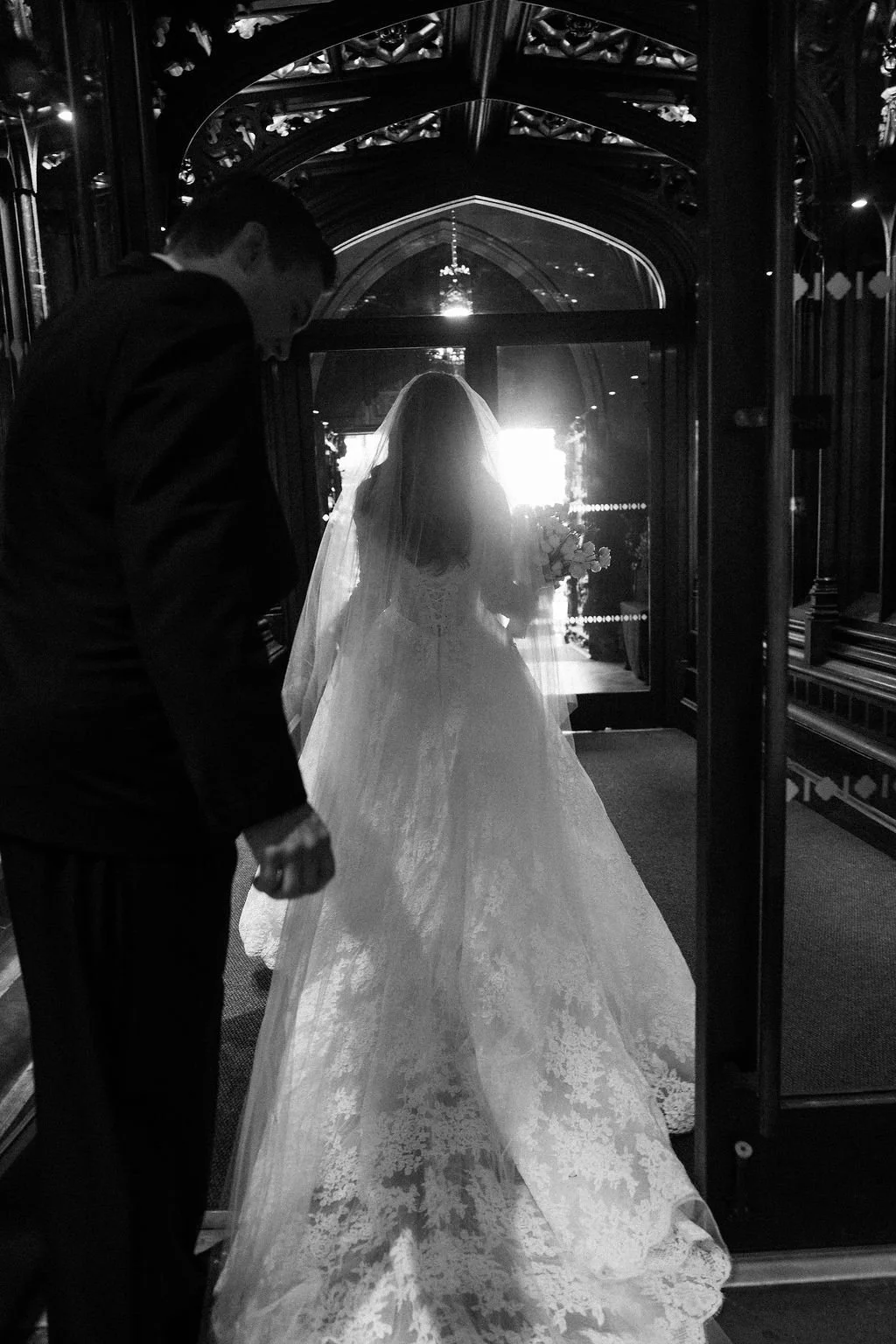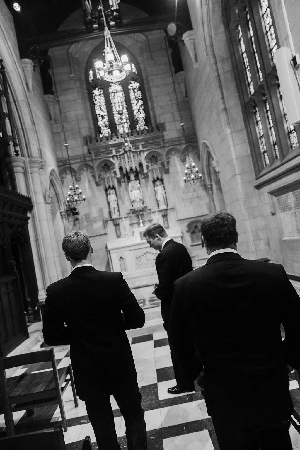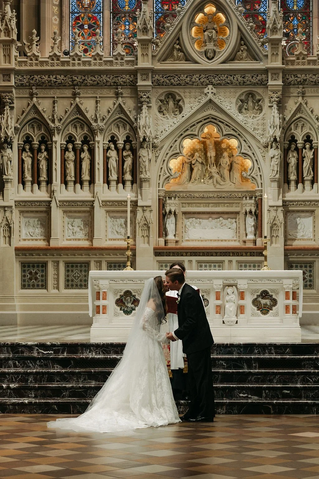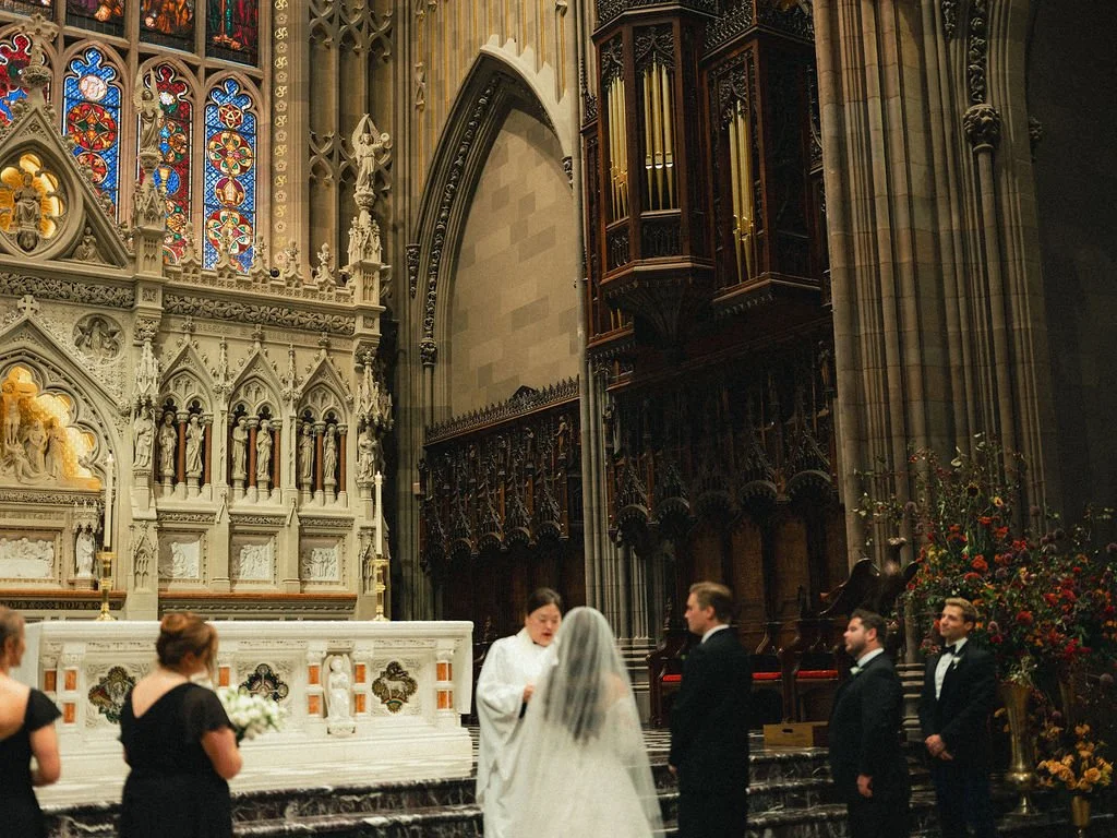 Rebecca and Spencer were married at Trinity Church, which is even more beautiful in person. The architecture is stunning from every angle - towering arches, detailed stonework, and stained-glass windows that fill the space with the softest, most atmospheric light. The whole church feels regal and calm - its deep rooted history settling around you.