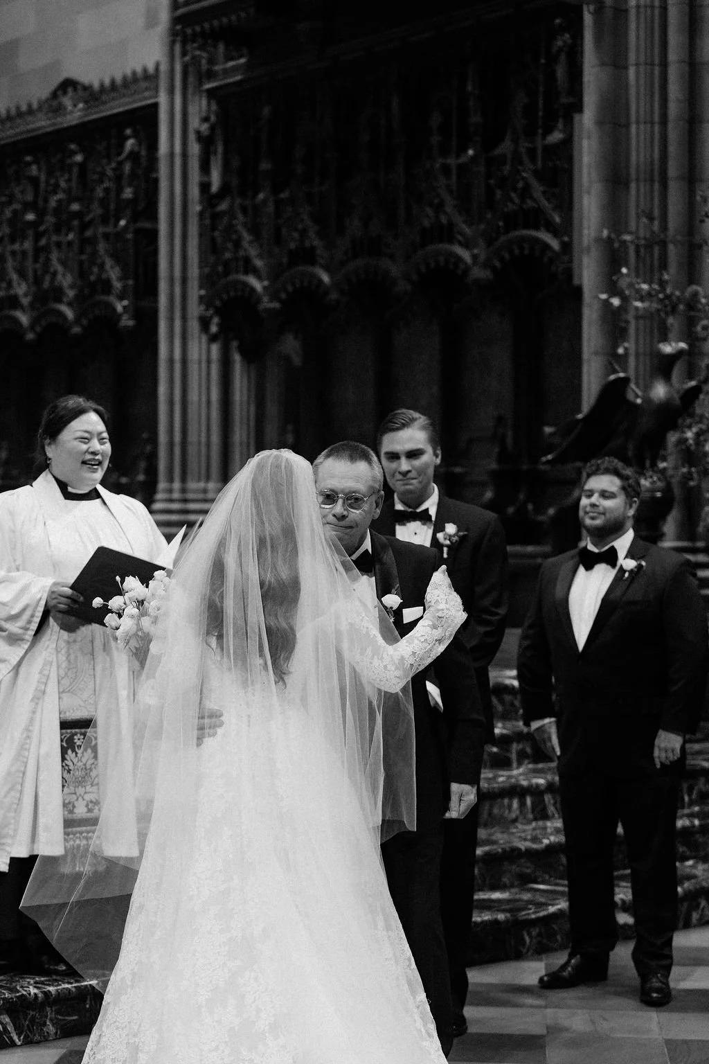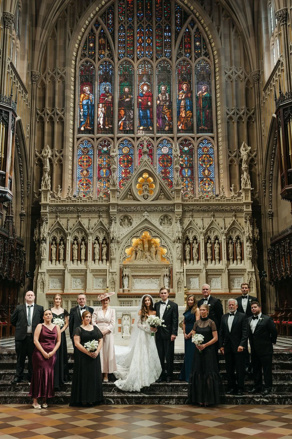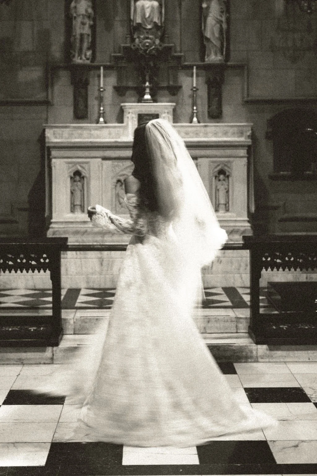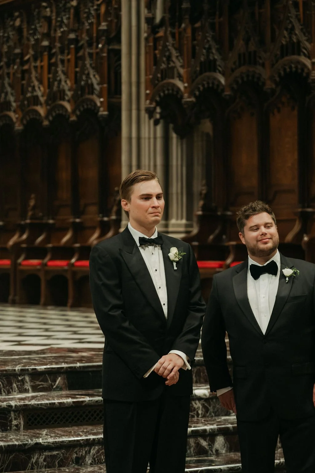 Rebecca and Spencer were married at Trinity Church, which is even more beautiful in person. The architecture is stunning from every angle - towering arches, detailed stonework, and stained-glass windows that fill the space with the softest, most atmospheric light. The whole church feels regal and calm - its deep rooted history settling around you.