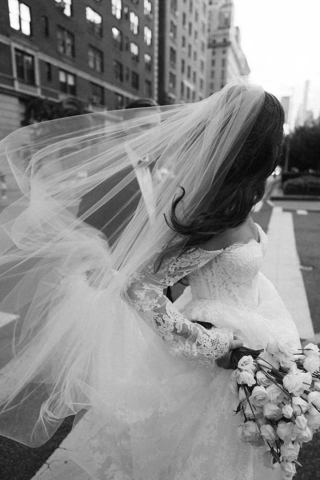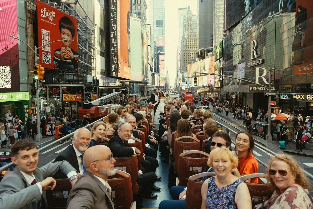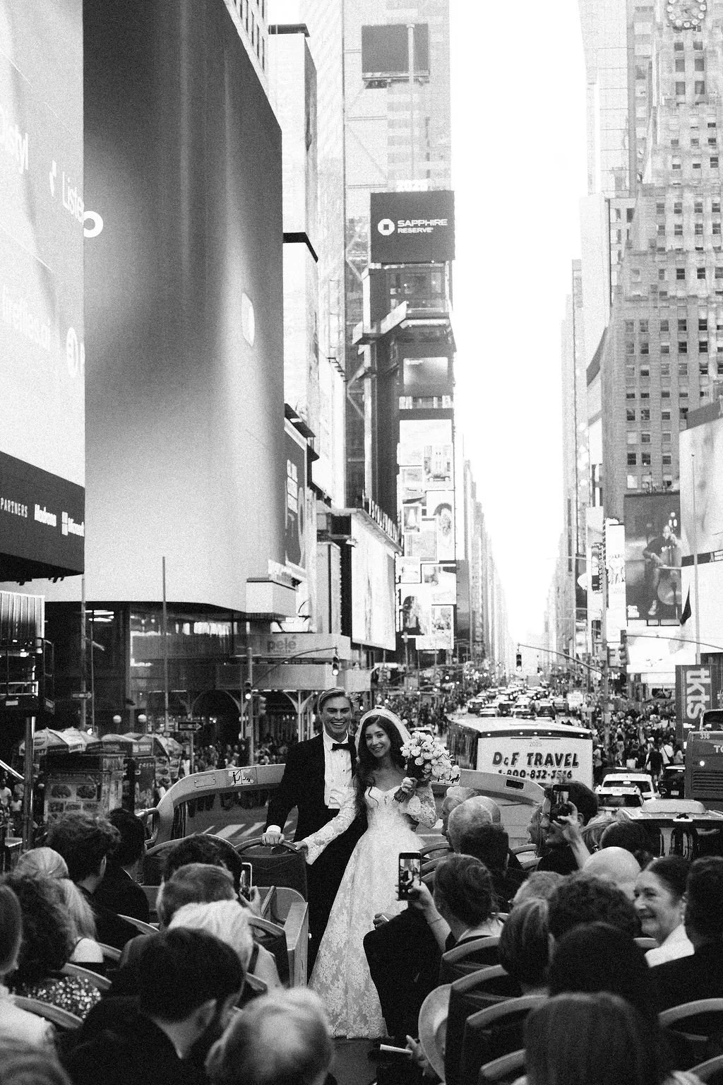 After promising forever to each other, they, and all of their guests, boarded a double-decker bus and headed to the reception, taking the scenic route through Times Square. It was one of those fun, very “New York” moments. An iconic experience as street walkers waved, taking photos of the newly-weds, while others were completely unfazed, rushing past the bright lights and chaos like it was just any other day.